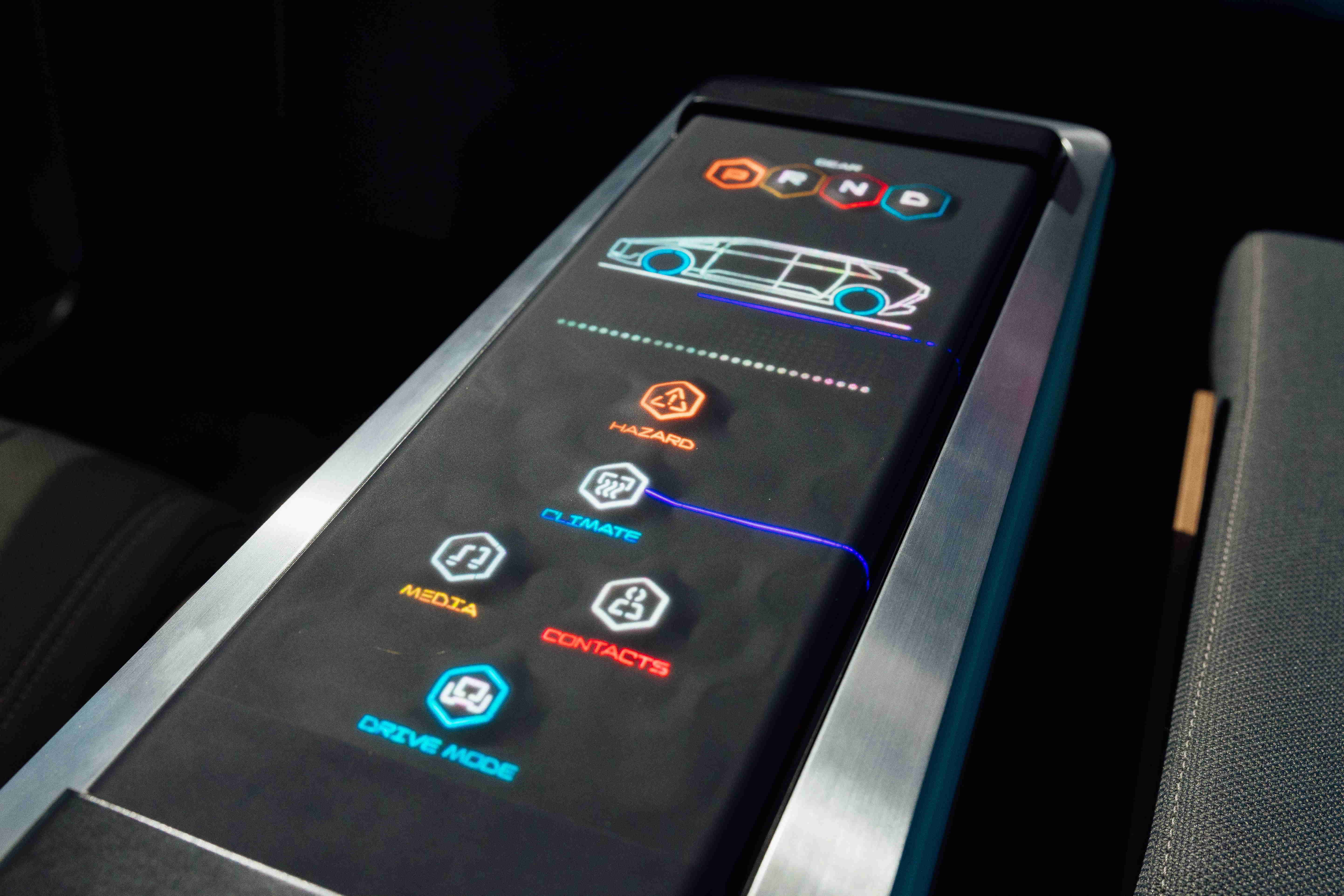 多變形態(tài)中控顯示(Morphing Center Control)擁有動態(tài)變化的表面,平時常態(tài)顯示車輛功能,進一步操作時,則會隆起成為3D 按鈕,并在觸控時以震動回?。躍傅牟僮骺慈嘶ザ戮辰?。