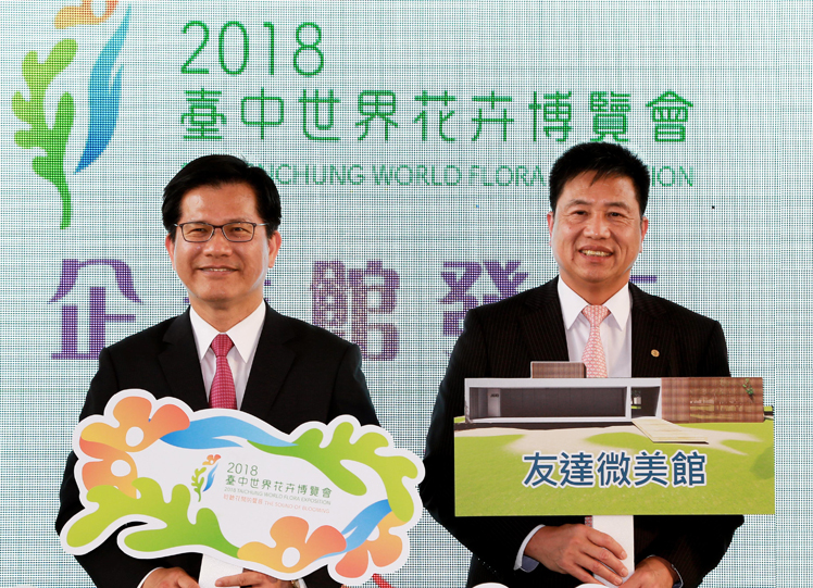 友達(dá)贊助 2018 臺中花博企業(yè)館,打造「友達(dá)微美館」(左:臺中市長林佳龍,右:友達(dá)光電董事長暨執(zhí)行長彭雙浪) |
