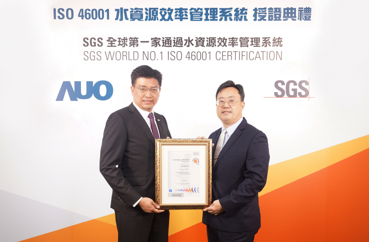 友達取得全臺第一張 ISO 46001 水資源效率管理系統驗證,透過嚴謹且精進的管理系統,具體展現永續承諾 (左:友達製造營運群副總經理林挺立,右:SGS 臺灣檢驗科技總裁邱志宏)