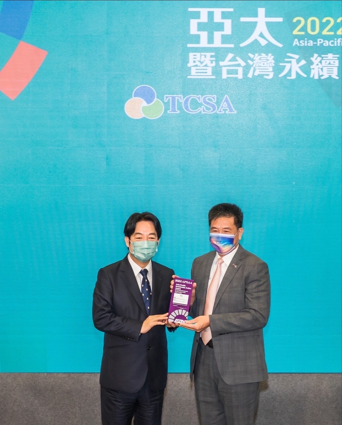 友達(dá)以卓越永續(xù)績效表現(xiàn),在第一屆亞太永續(xù)行動(dòng)獎(jiǎng)獲得肯定,由副總統(tǒng)賴清德頒獎(jiǎng)(左),友達(dá)光電董事長暨執(zhí)行長彭雙浪(右)代表領(lǐng)獎(jiǎng)